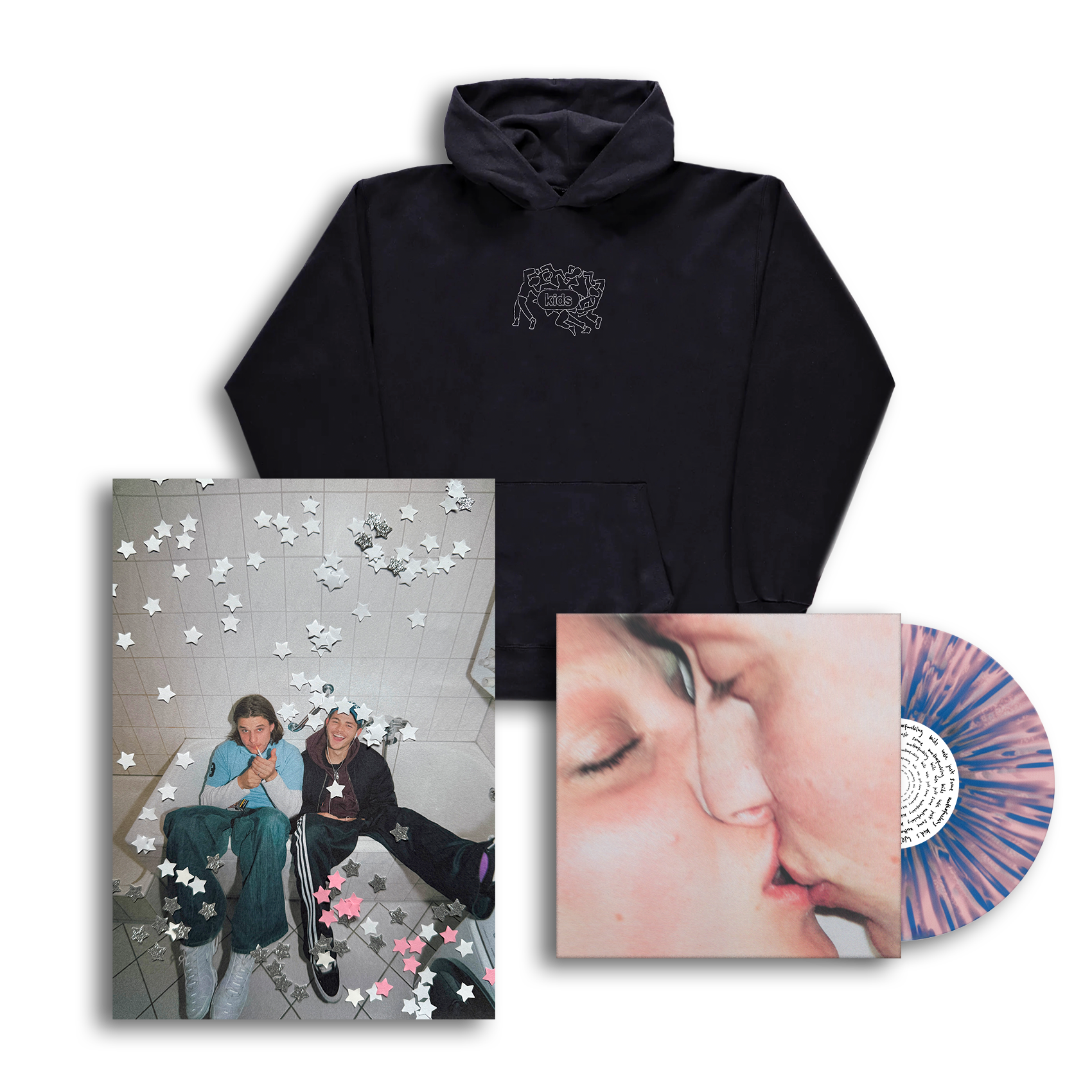 der „we are just some motherfucking kids“ hoodie – wie wir ihn liebevoll nennen – kommt in schickem schwarz mit weißem aufdruck. auch der hoodie kommt mit der speziellen und limitierten splatter vinyl (500 Stück). je nachdem wie hoch die nachfrage ist, machen wir vielleicht nochmal eine andere vinyl und/oder eine cd.